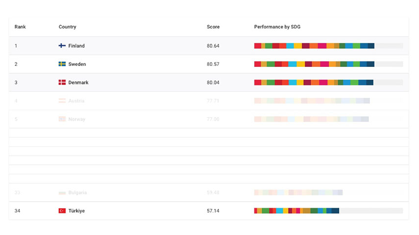Bu sıralamada ülkeler genel puanlarına göre sıralanmaktadır, genel puan ise 17 SKA’nın tamamına ulaşmaya yönelik toplam ilerlemeyi ölçmektedir. 100 tam puanın tüm SKA’lara ulaşıldığının göstergesi olduğu göz önüne alınınca alınan puanın SKA’lara ulaşma konusunda başarı yüzdesi gibi düşünülmesi mümkündür. Söz konusu genel puanlamaya göre bu sene Finlandiya %80.64 puanla ilk sıraya yerleşirken, Finlandiya’yı 2. Sırada 80.57 puanla İsveç, 80.04 puanla Danimarka izlemekte. 38 ülkenin bulunduğu sıralamada ülkemiz 57.14 puan ile 34. Sırada yer alıyor.