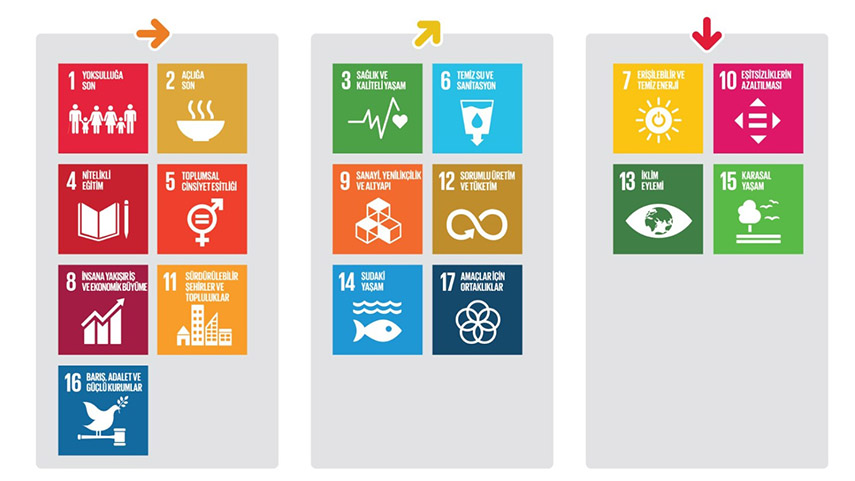 Aday ülkeler kategorisinde yer alan Türkiye’nin 17 SKA’daki ilerlemesi incelendiğinde ortaya çıkan tablo kötünün iyisi. 17 SKA içinde %23 olumsuz ilerleme, %33 sınırlı ilerleme ve %43 başarılan ya da olumlu ilerleme SKA değerlendirmesi görülüyor.