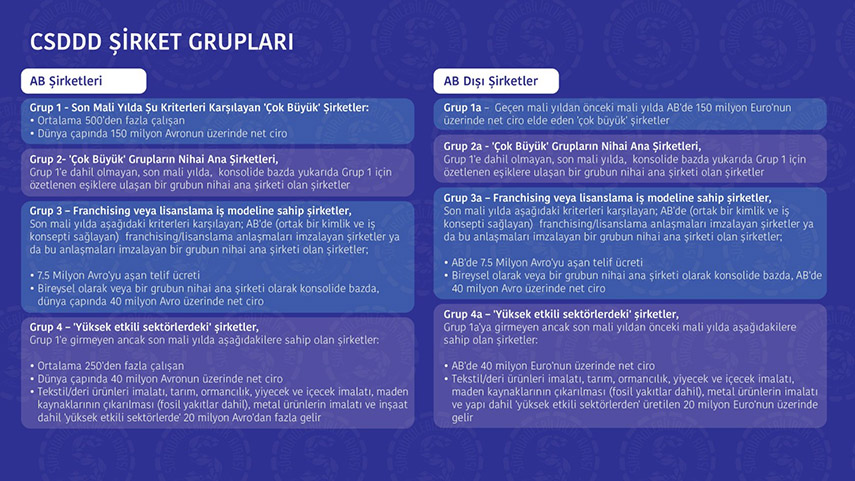 İşletmelerin etkileri üzerine düşünmesini zorunlu kılacak olan CSDD’ye dahil olacak şirketler, diğer yasal düzenlemelerde olduğu gibi kademeli geçiş ile ölçeğe girecekler. AB (Avrupa Birliği) şirketleri ve AB dışı şirketler olarak ve özellikleri bazında farklı gruplar halinde kategorize edilen şirketler için CSDD takvimi 2029’a kadar uzanıyor.