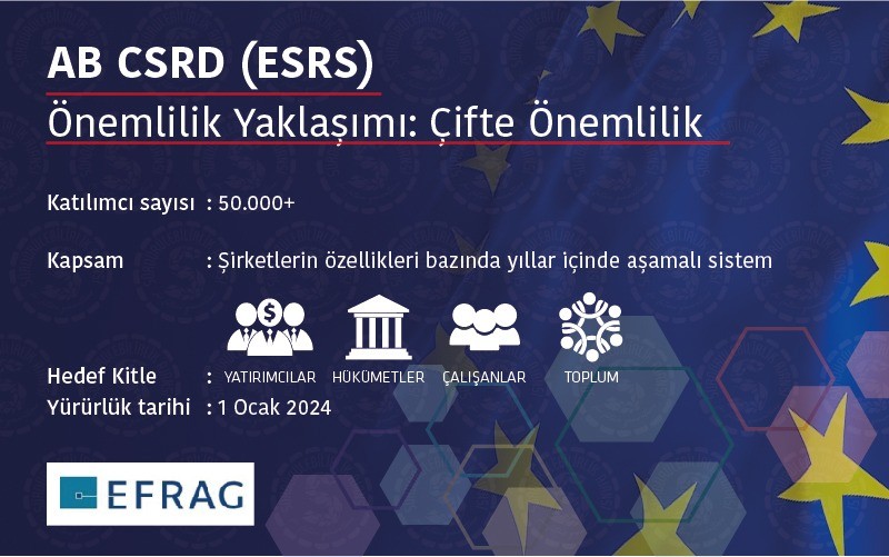 Merkezinde ‘Çifte Önemlilik’ konusunun yer aldığı ESRS’de yatırımcıların yanı sıra diğer paydaşlar hedef kitle görülürken hem işletmenin sürdürülebilirlik üzerindeki etkileri hem de sürdürülebilirlik gelişmelerinin işletmenin finansal yaşamı üzerindeki etkisi değerlendirmeye alınıyor.
