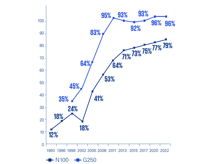 Daha iyi bir yükseliş trendine sahip olan N100 şirketlerinde 1993 yılında %12’lik bir oranla başlayan sürdürülebilirlik raporlaması süreci 2020 yılındaki araştırmada %79’luk bir raporlama oranına ulaşmıştır. KPMG’nin 2022 yılı raporuna göre N100 şirketlerinin %80’i sürdürülebilirlik raporu yayınlamaktadır.