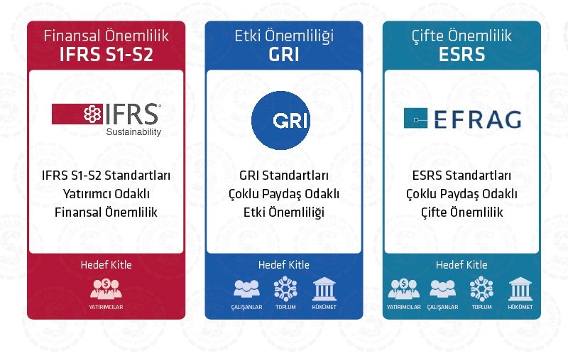 Görselde görüleceği üzere Finansal Önemlilik yaklaşımını benimseyen IFRS, yatırımcıları hedeflerken, Etki Önemliliği odağındaki GRI sürdürülebilirlik konularıyla ilgilenen diğer paydaşları hedeflemektedir. Çifte Önemlilik odağıyla iki yaklaşımı birleştirmeyi amaçlayan ESRS’nin hedef kitlesi ise hem yatırımcı hem diğer tüm paydaşlar olmaktadır.