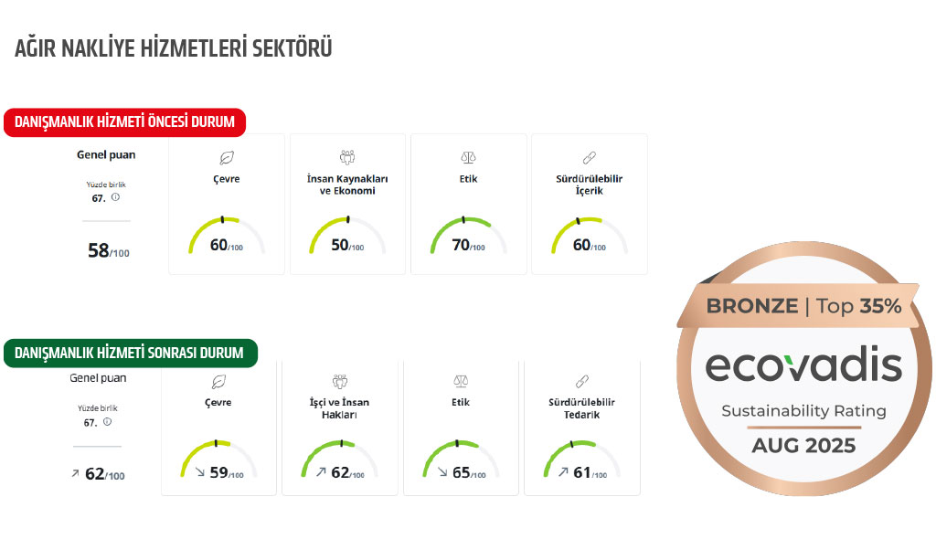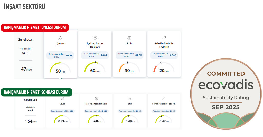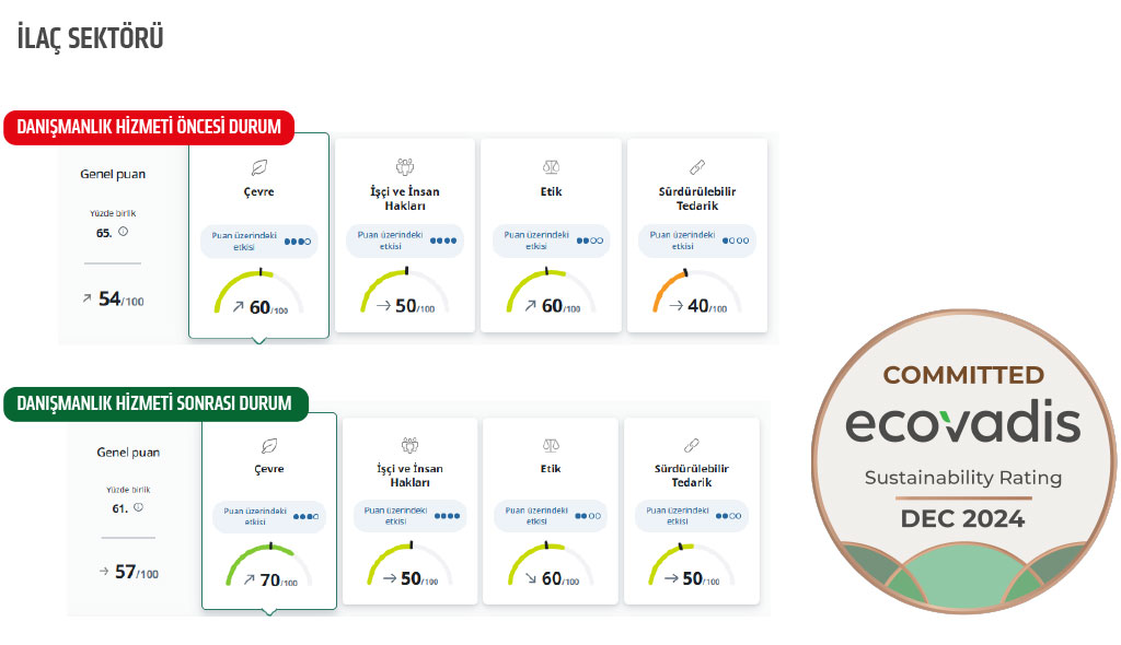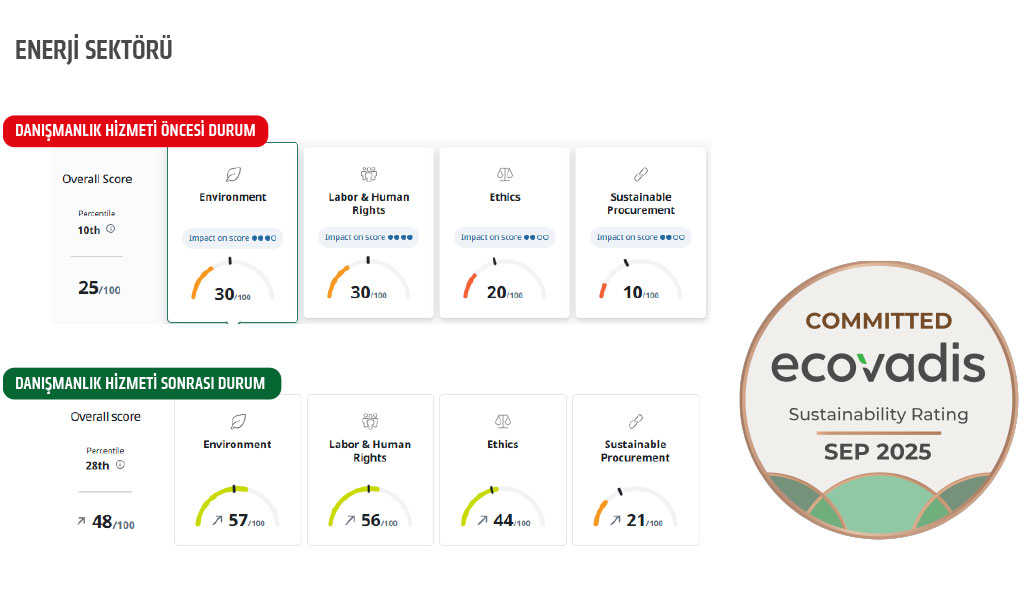 Aşağıda danışmanlık verdiğimiz firmaların EcoVadis göstergelerine önce-sonra şeklinde yer verilmiştir.